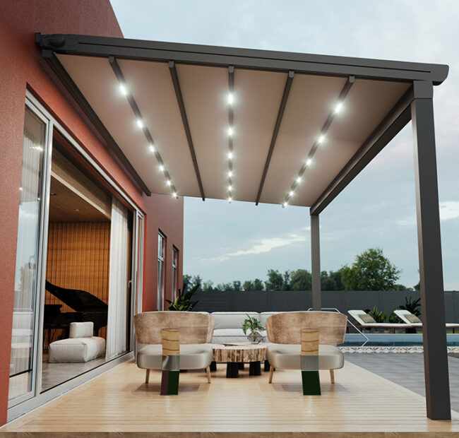 Pergole pružaju zaštitu od jakog sunca, omogućavajući udobno sjedenje bez direktnog uticaja toplote. Pergola tende su posebno popularne na stambenim terasama i balkonima, kao i na vanjskim ulazima poslovnih prostora. LED osvijetljene pergola tende, postavljene na platneni krov, dodatno doprinose atraktivnom izgledu i poboljšavaju kvalitet boravka na otvorenom tokom noći. Glavna konstrukcija sistema izrađena je od aluminijskih profila i čeličnih spojnih elemenata. Otporna je na sve vanjske uslove poput kiše, snijega, leda, jakog sunca i snažnog vjetra.